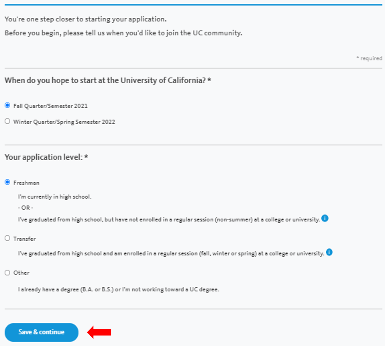 Transfer – para alunos que estão transferindo créditos de uma instituição de ensino superior. Em seguida clique em “Save & continue”.