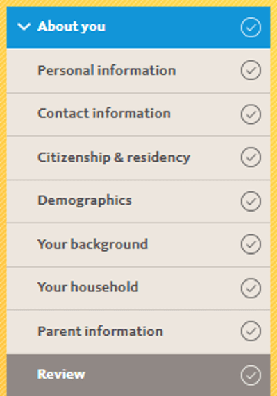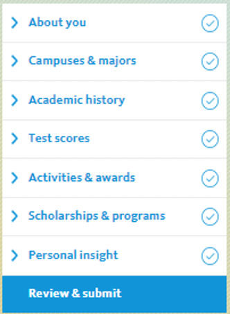 Obs.: Se você tiver itens restantes a serem completado, verá um aviso To Do ao lado dessa subseção final; Você não poderá enviar sua inscrição até que toda a application tenha sido devidamente preenchida e as seções estejam indicadas com uma check mark (✓).