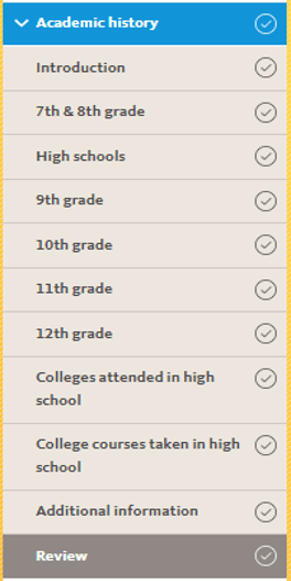 - 9th grade, 10th grade, 11th grade & 12th grade – Todos os candidatos precisam inserir suas disciplinas e respectivas notas ao longo do ensino médio. Os cursos são declarados por níveis de instrução, começando com a nona série. Os alunos que frequentaram mais de uma escola devem certificar-se de inserir as disciplinas das diferentes instituições nas abas da escola correta.