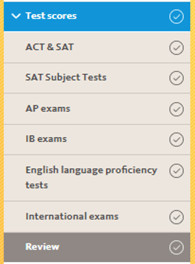 - Nesta sessão você deve incluir quais testes já fez até dado momento da candidatura. Estes são: ACT, SAT, SAT Subject Tests, AP Exams, IB Eexams, English Language Proficiency Tests (Cambridge, IELTS, TOEFL, TOEIC, Duolingo, etc.), International Exams, etc. Lembre-se de seguir a estratégia definida com o/a estrategista do seu time. Se o alinhado foi aplicar como test optional, nesse campo você não deverá mencionar sua nota do SAT/ACT.