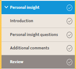 - Personal insight questions: Nesta subseção, você deverá incluir 4 produções textuais que escolheu desenvolver com o seu Orientador de Redações.