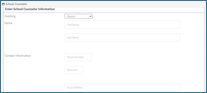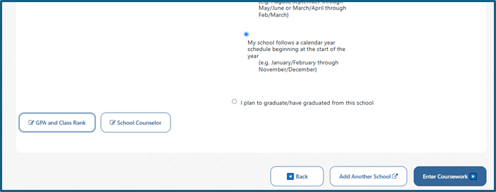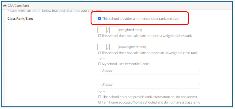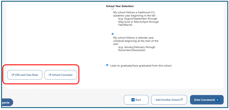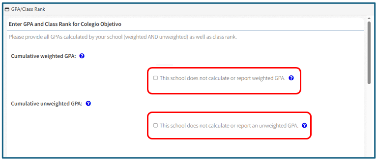 Após selecionar o tipo de currículo da sua escola, será necessário preencher as seções ‘GPA and Class Rank’ e ‘School Counselor’.