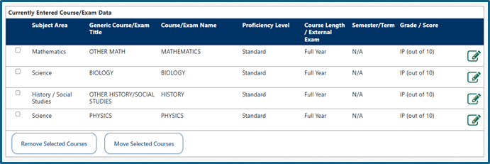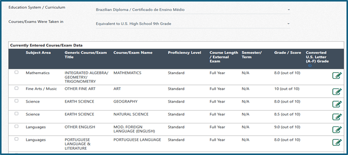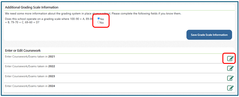 Em ‘Additional Grading Scale Information’, selecione ‘Yes’. Para adicionar todas as matérias do seu histórico escolar, clique no ícone ‘Editar’, representado pelo quadrado com o lápis.