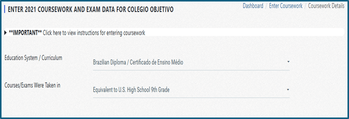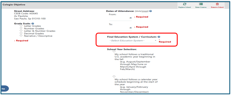 1. Final Education System / Curriculum: Para alunos brasileiros, selecione: Central & South América > Brazilian Diploma / Certificado de Ensino Médio.