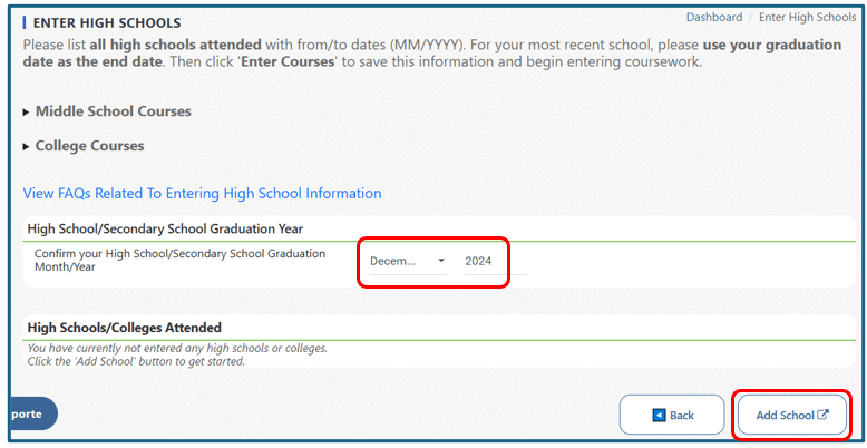 Informe o mês e o ano da sua formatura no ensino médio. Em seguida, clique no botão ‘Add School’ (circulado em vermelho).