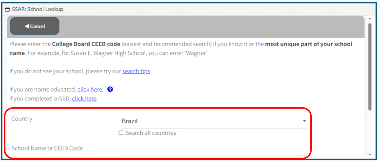 Informe o país onde sua escola está localizada e pesquise pelo nome da instituição. Se encontrar sua escola na lista de resultados, selecione-a e avance para o passo de preenchimento do seu histórico.