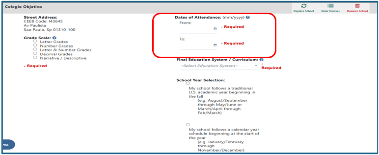1. Dates of Attendance: Informe a data de início e a data de término do seu período na escola.