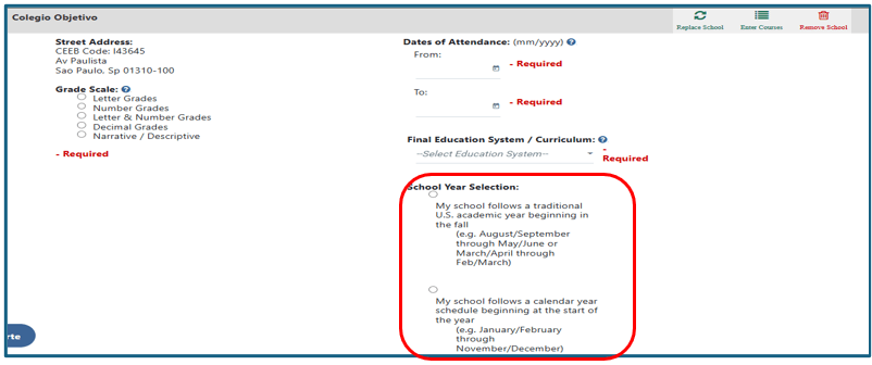 Se sua escola segue o currículo americano, selecionar ‘My school follows a traditional U.S. academic year beginning in the fall (e.g. August/September through May/June or March/April through Feb/March)‘