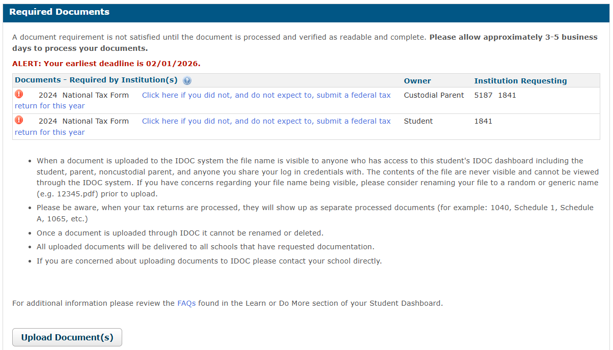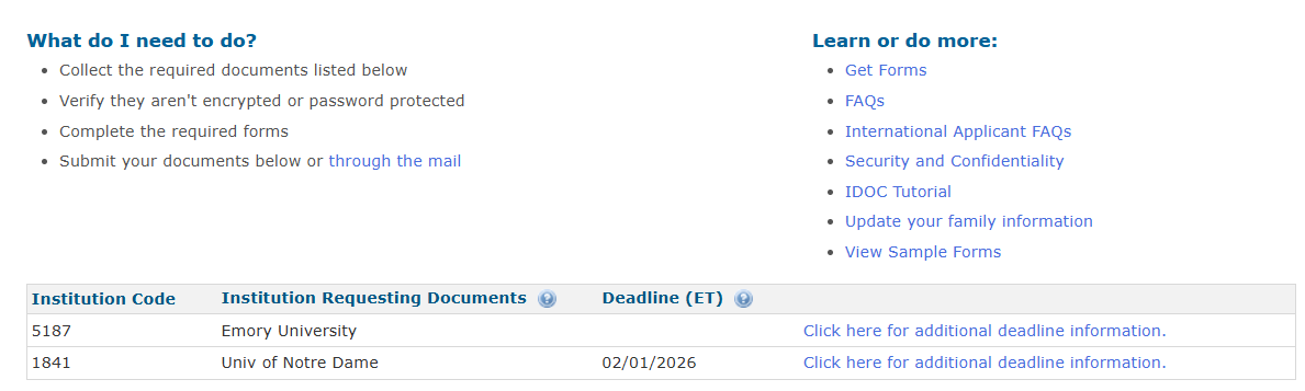 Importante: dependendo das universidades para as quais você aplicou, o IDOC pode não aparecer. Isso significa que essas instituições não utilizam o serviço e, portanto, não informam ao College Board quais documentos devem ser enviados. Nesse caso, você deve acessar diretamente o portal da universidade e verificar a lista de documentos solicitados.